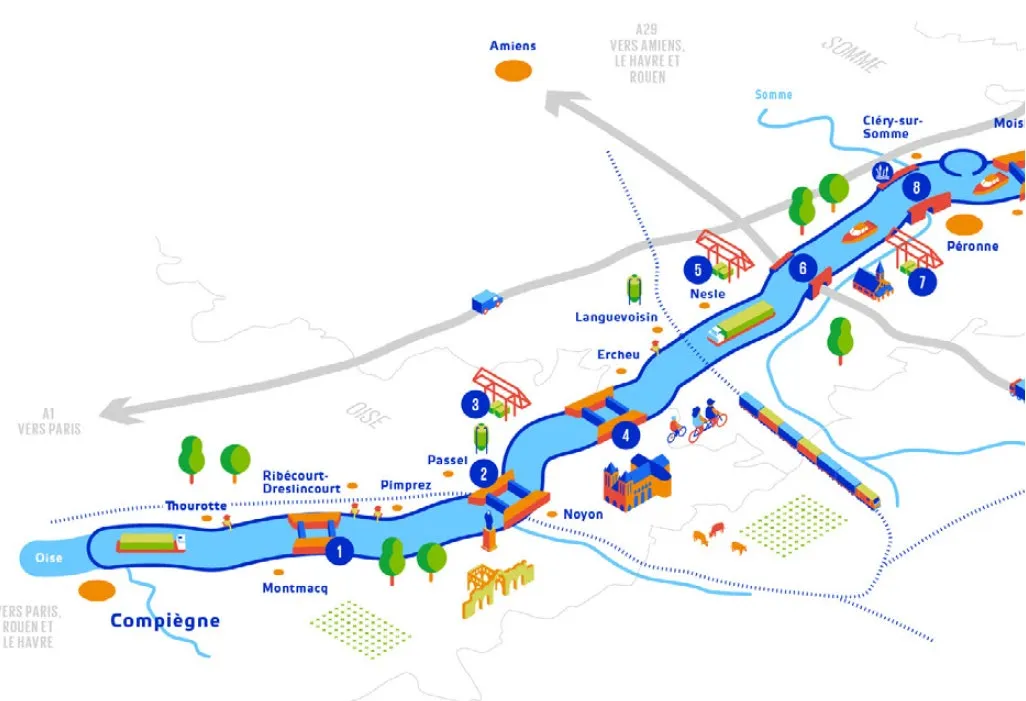 Le Canal Seine-Nord Europe (CSNE), grand projet d’aménagement du territoire porté par la Société du Canal Seine Nord Europe, va relier Compiègne à Aubencheul-Au-Bac d’ici 2030. Ce canal à grand gabarit (107 km de long et 54 m de large) est un maillon essentiel de la liaison fluviale Seine-Escaut, qui connectera le réseau français aux 20 000 km de voies navigables européennes.