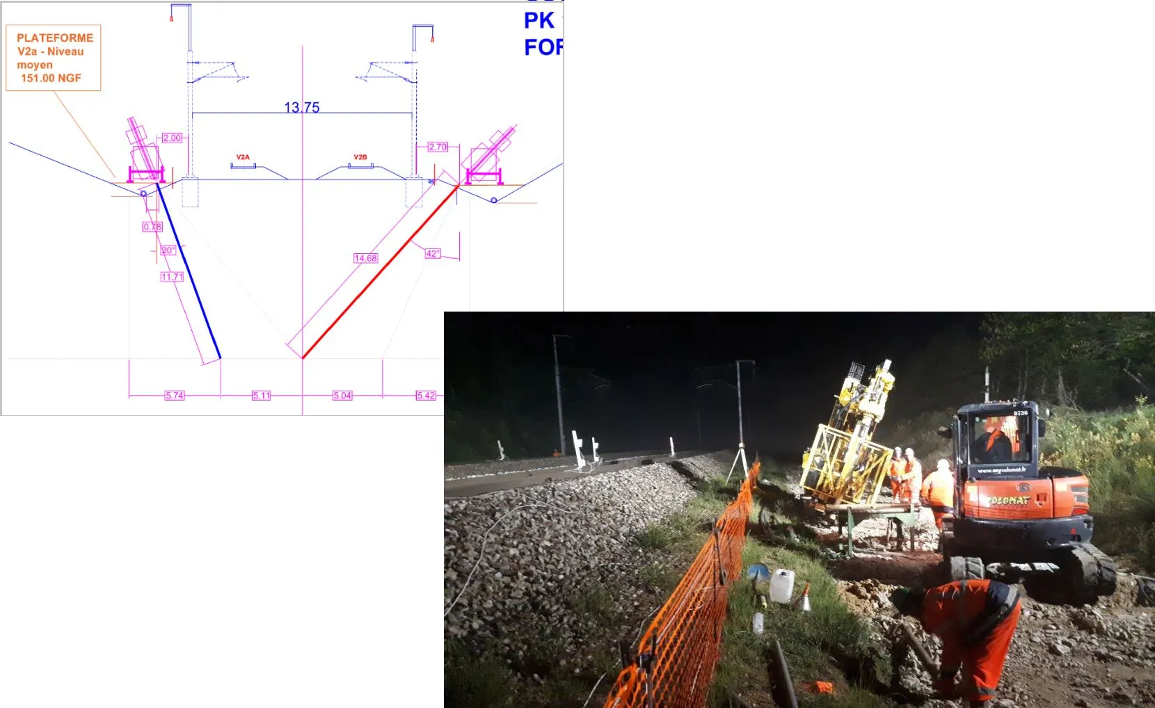 Après les forages de barrage (réalisé verticalement sur 6 m de profondeur), Les forages d’injection ont été réalisés depuis les plateformes latérales avec une inclinaison variant de 22° à 40° et de longueur variant de 12 à 15 m selon un espacement 3.0m de sorte à couvrir l’intégralité de la plateforme sous voies. Le volume total de coulis d’injection prévisionnel est estimé à 4 230 m3. Les profondeurs des marnières ont été identifiées autour de 12 m environ.